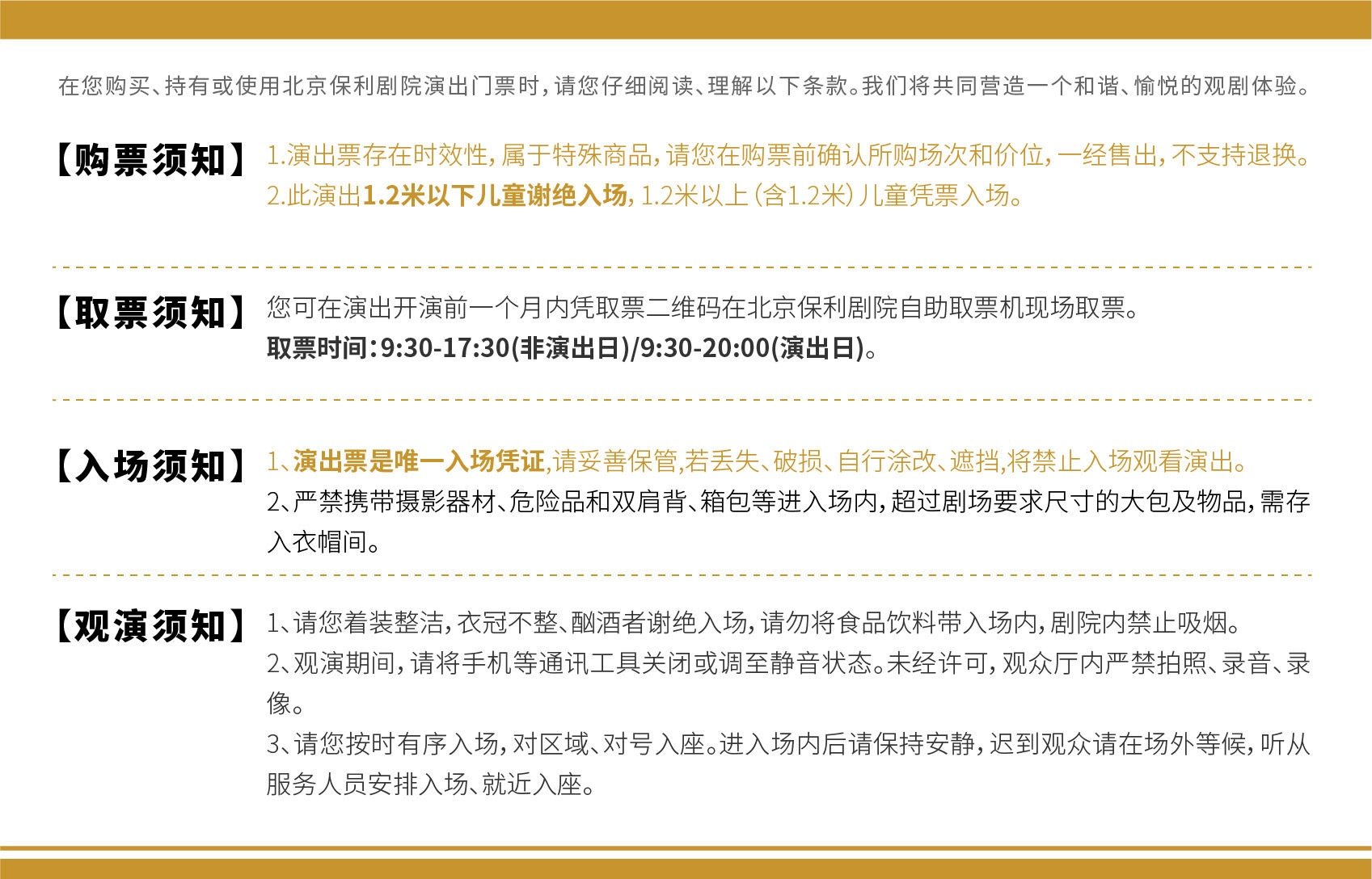 亲子类演出,儿童一律凭票入场;非儿童亲子类演出,1.2米以上儿童凭票入场,1.2米以下儿童谢绝入场;