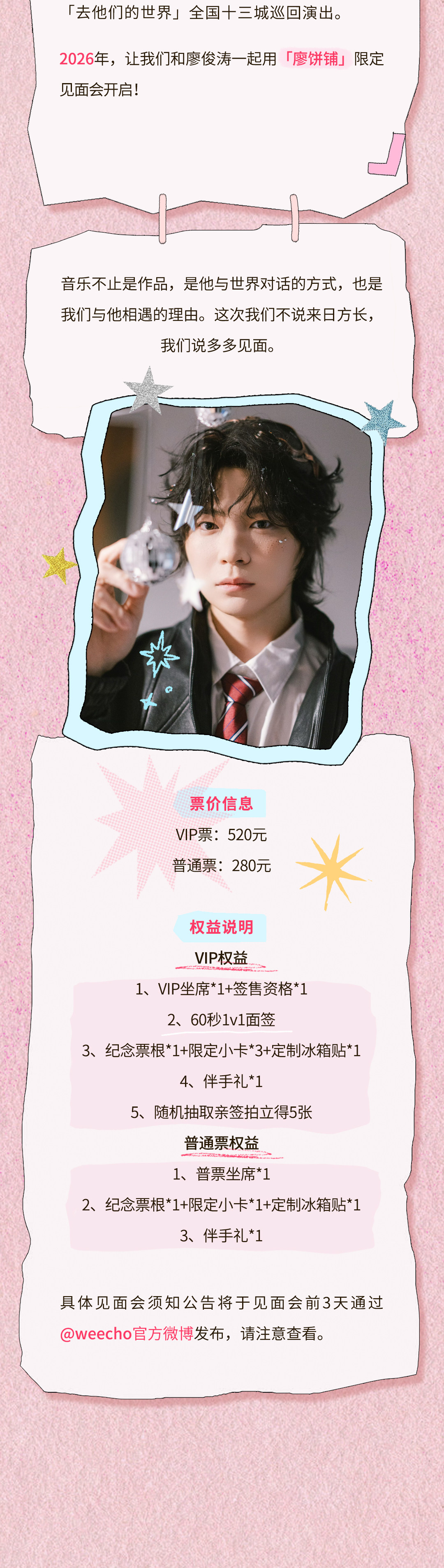 本场见面会为实名制购票入场,同一证件至多对应六张见面会门票,消费者不得使用同一证件在多个购票渠道进行超额购票,若因此造成的相关损失,由购票人自行承担。