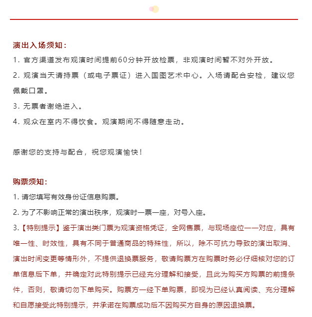1.购买前请您提前规划好行程,做好相应准备,以免影响您的正常观演,感谢您的理解和配合。