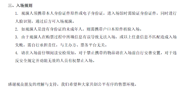 1.购买前请您提前规划好行程,做好相应准备,以免影响您的正常观演,感谢您的理解和配合。
