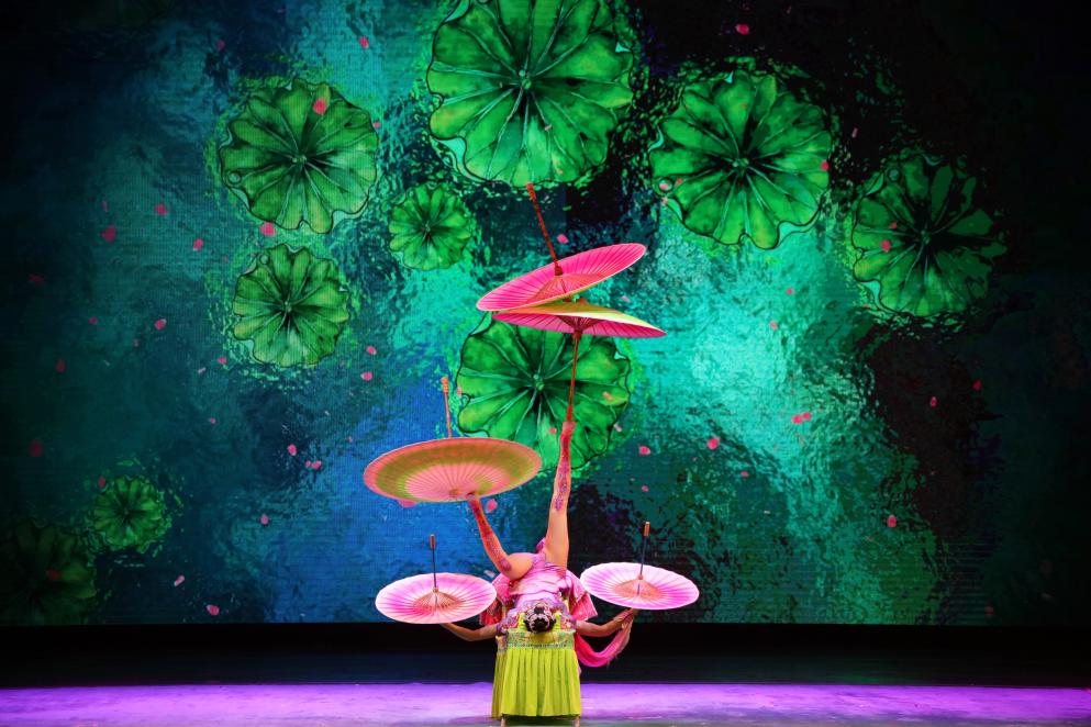 舞台中间一朵百莲开放,女演员如同花仙子一般妙曼动人,演员用双脚完全控制伞的起落翻飞,伞的数量从一把到四把,手脚并用时达到六把,时而侧飞,时而走边,时而大摆,飘逸中深藏几分沉稳。一连串相继展开的技巧,恰如神来之助,彰显了“足之舞蹈”的灵巧秀气。