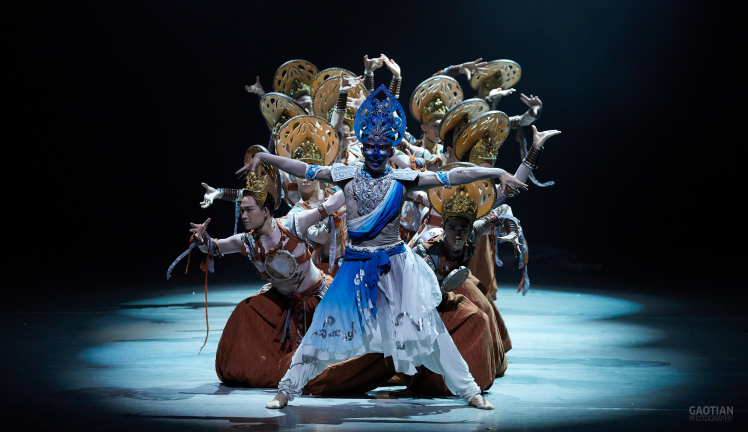 作品简介:伎乐飞天指手持各种乐器的飞天,寓意中华民族对爱与自由,对真善与美的极致追求。初唐329窟是其艺术发展高峰的典型洞窟,群集龛顶,冲破严整行列在空中自由飞翔,使之在天花流云中自在沉浮,更显灵动活泼。通过无实物的表演方式,以身体的让、旋、探及手部的弹、捏、击等呈现伎乐飞天持乐器而舞时的自在美感。塑造其走向画外之象的追求,不只化实相为空灵,引人精神飞越,更期许它能进一步深入生命节奏的核心。