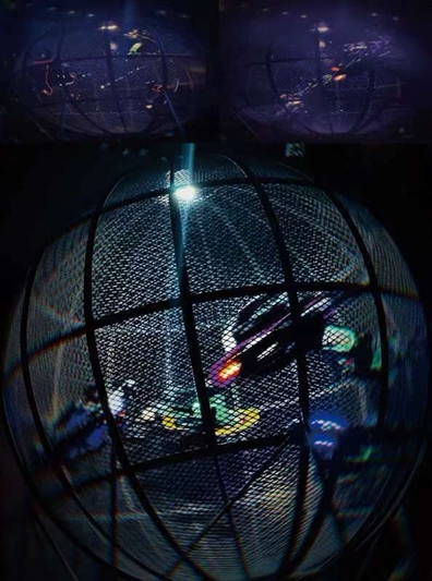 由五名演员完成,环球飞车是一场将在直径只有6.5米乃至仅有4.5米的圆形铁球内,5辆摩托车以每小时80公里的速度完成交叉穿越,90°飞行,360°旋转等高难度动作,视觉效果惊悚的摩托特技秀。