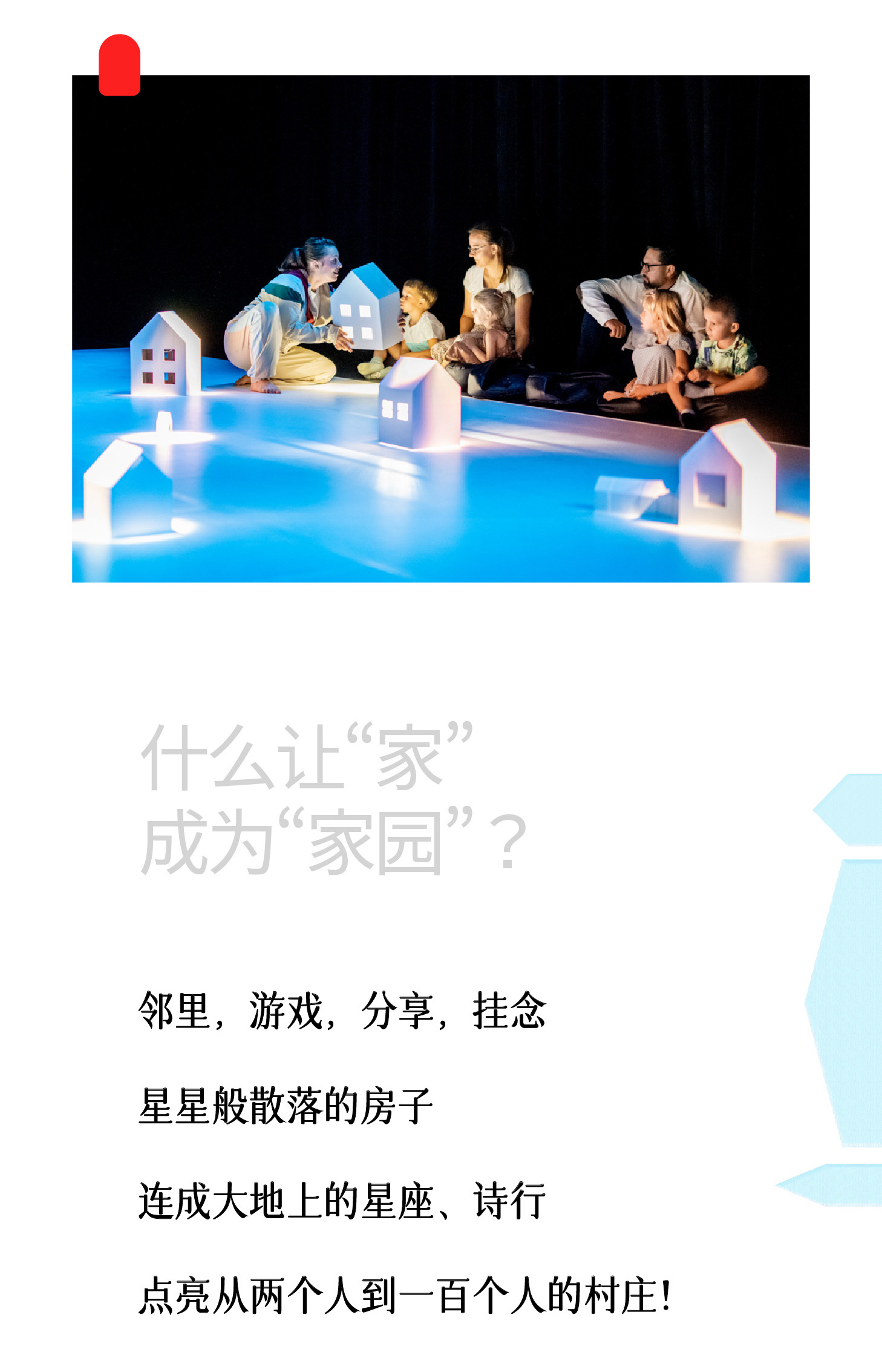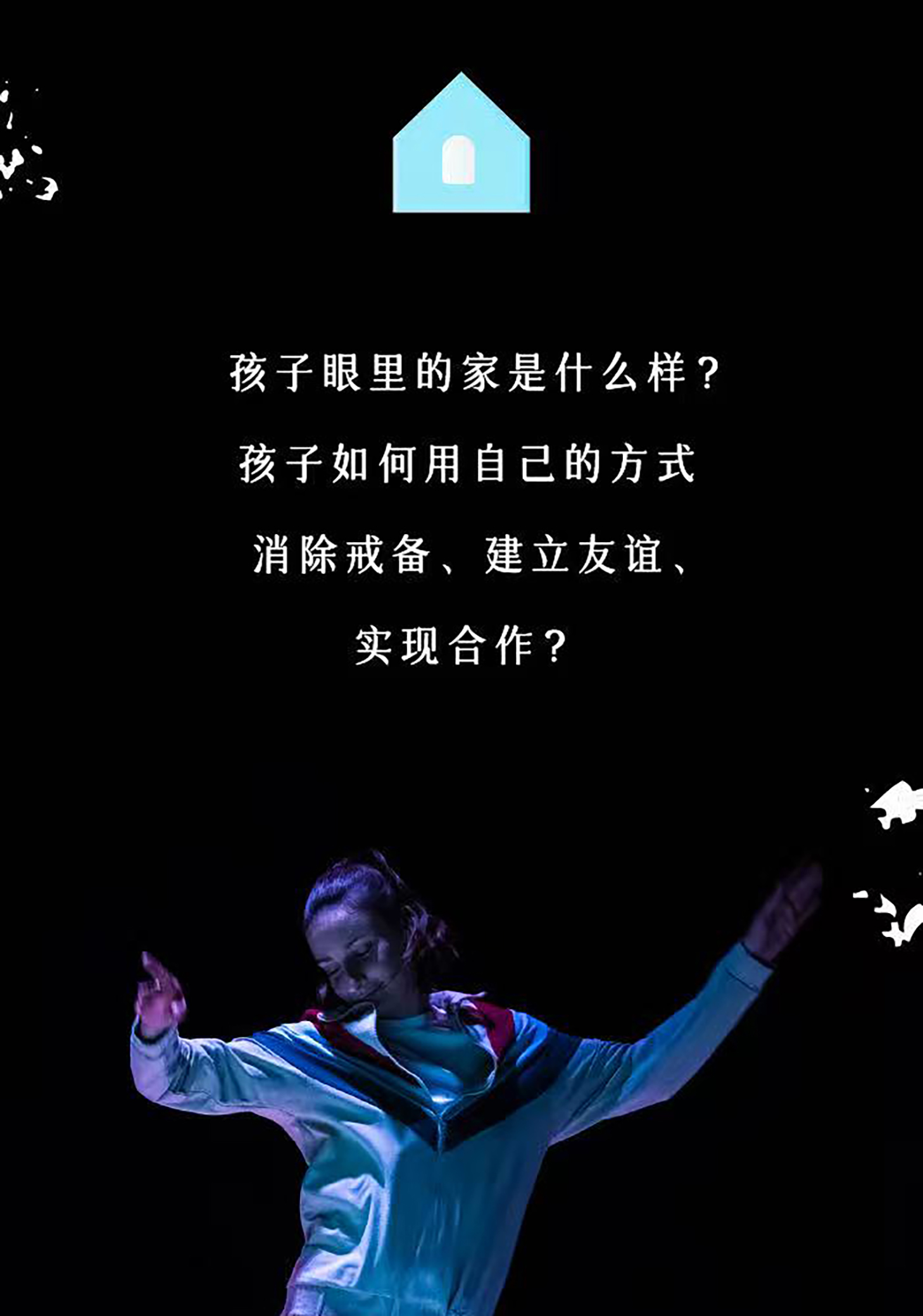 宝宝人生第一场社交盛宴!本场演出将邀请家庭进入“村庄”,在温和的舞蹈和音乐引导下熟悉环境、结识“邻居”,以家庭为单位参与小房子的游戏,创造独特的亲子回忆!