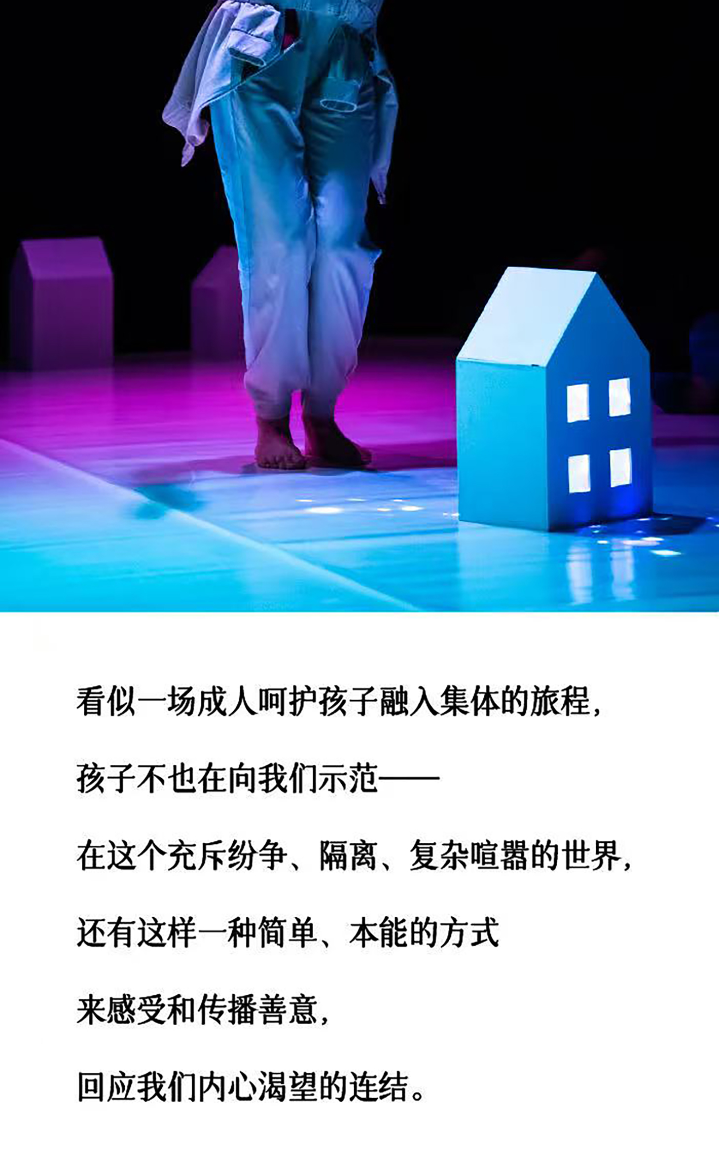 感官先行,用身体说话。这是一部结合舞蹈、动作与装置的表演作品。演员通过模仿宝宝的行为语言—指尖轻触、好奇张望、拥抱试探,在纯白舞台上,演绎出从“我一个人”到“我们在一起”的温暖过程。