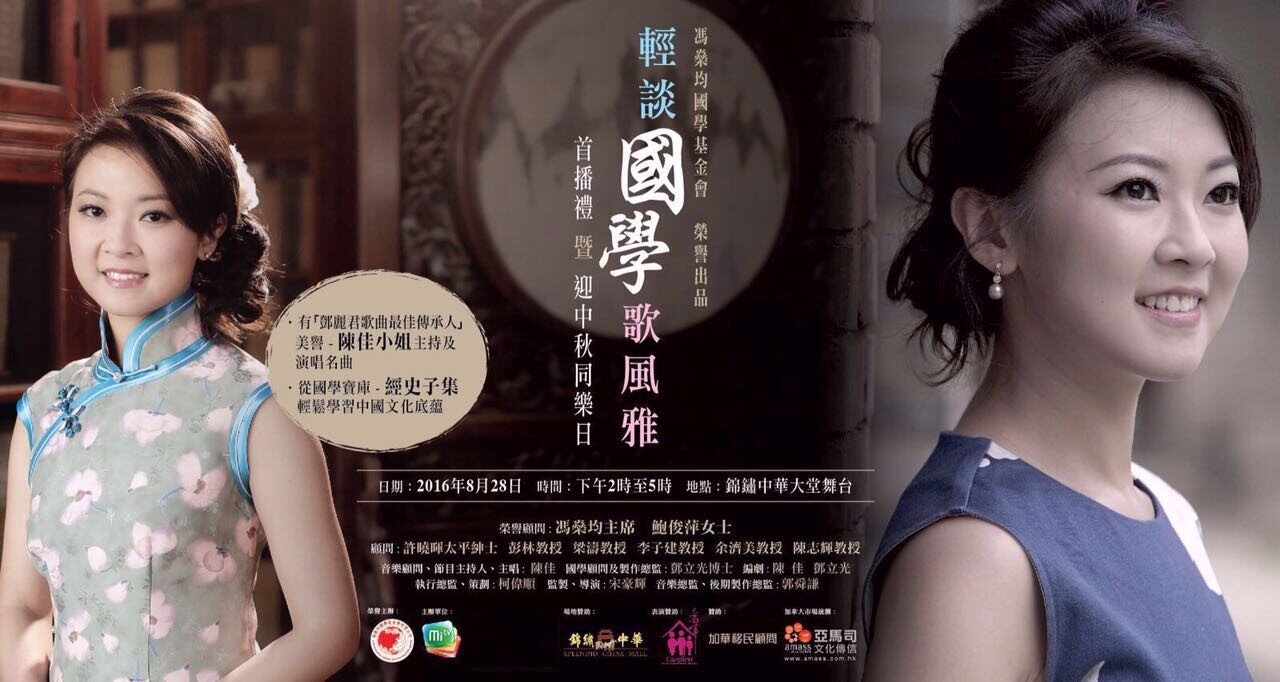 2016年起,陈佳凭借个人的文学修养和温婉高雅的书卷气质,被香港冯燊均国学基金会聘请为顾问,并在基金会推出的一系列国学节目《轻谈国学歌风雅》中担任主持人、撰稿人、音乐总监,用说与唱结合的方式传承优秀中华文化。