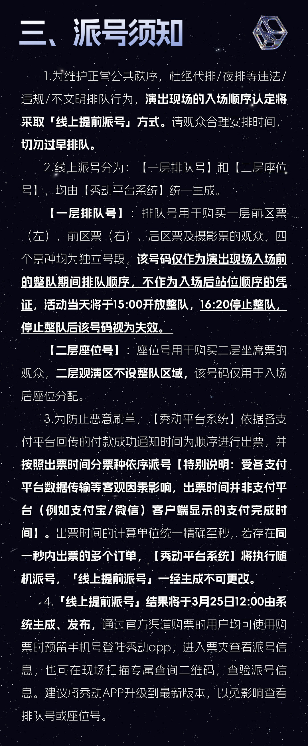 3.商品预售期间,票价调整及最终销售数量将由主办方和演出场馆确定,正式开票后将根据用户付款的先后顺序依次配票。我们会尽量满足用户需求,如最终未能配票,购票通承诺全额退款,敬请谅解。