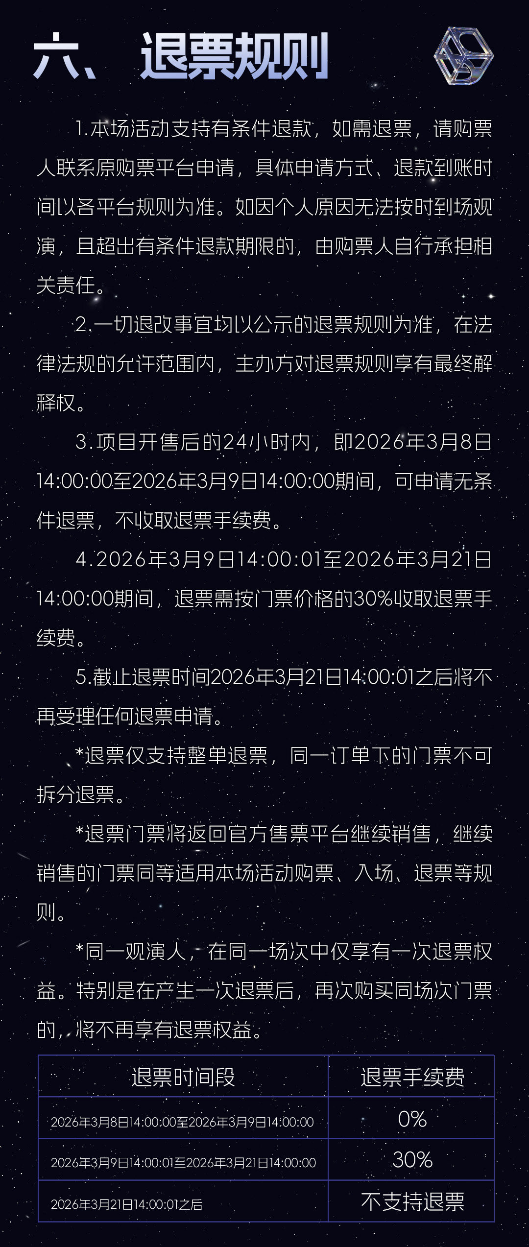 5.票品为有价证券,非普通商品,其背后承载的文化服务具有时效性、稀缺性等特征,不支持退换。如您购票后无法正常观看,还请自行处理。