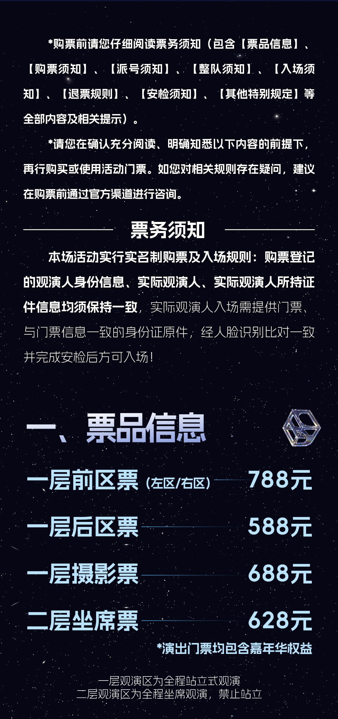 购买演出票之前请一定仔细核对日期和场次票价。购买同场同价位,单笔订单购买,默认连坐出票,如位置不能满足连坐需求,客服会与您电话沟通;