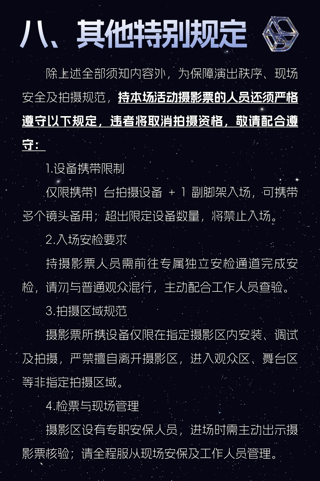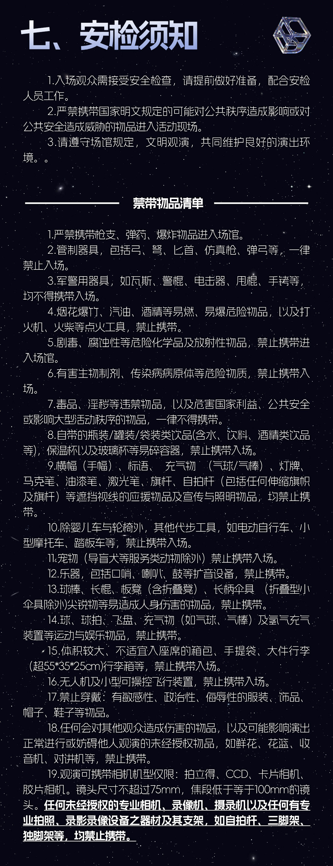 由于安保和版权的原因,大多数演出、展览及比赛场所禁止携带食品、饮料、专业摄录设备、打火机等物品,请您注意现场工作人员和广播的提示,予以配合