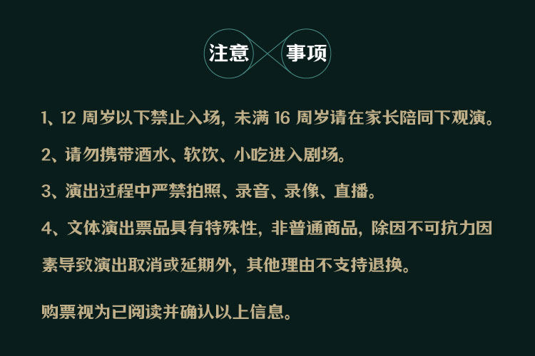 5.票品为有价证券,非普通商品,其背后承载的文化服务具有时效性、稀缺性等特征,不支持退换。如您购票后无法正常观看,还请自行处理。