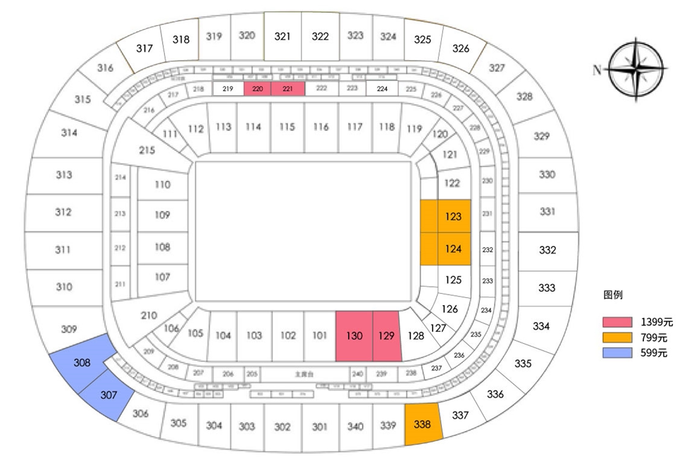A档4场联票,票价1399元:130区、129区、220区、221区