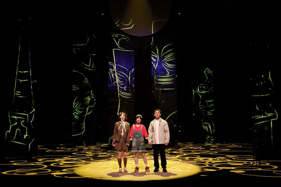 本剧运用儿童视角消解历史厚重感:陶猪化身“宇宙快乐使者”、青铜人头像成“奥特快兄弟”,将学术谜题转化为充满童真的奇幻故事。舞台互动设计(如观众参与麻将游戏、扫码弹幕答题)增强沉浸感,让严肃的考古主题变得生动可及。